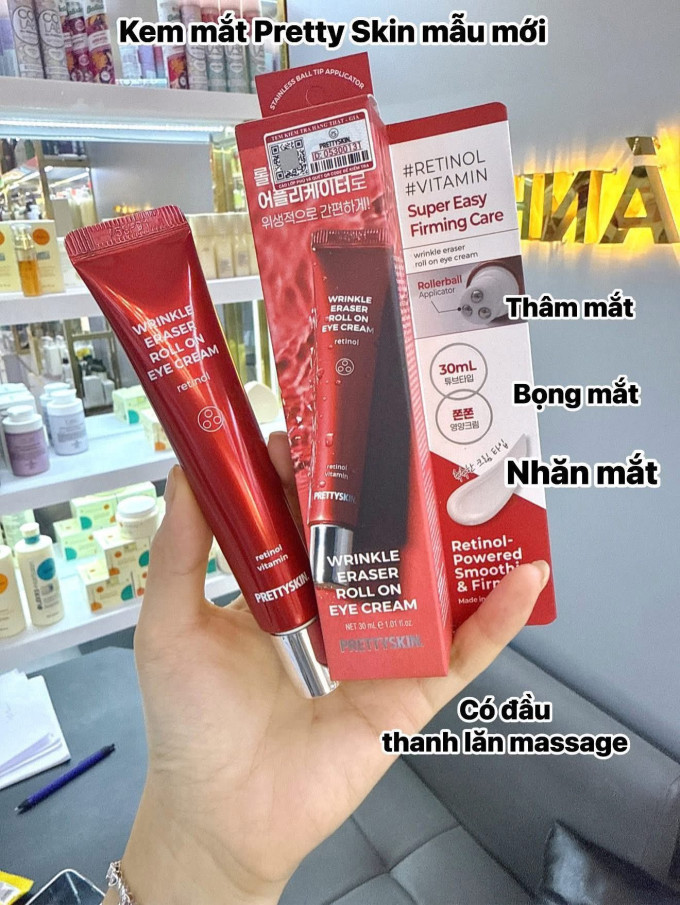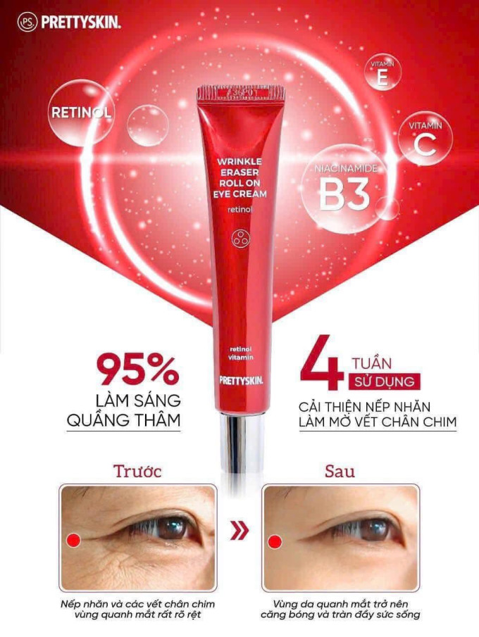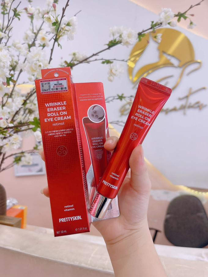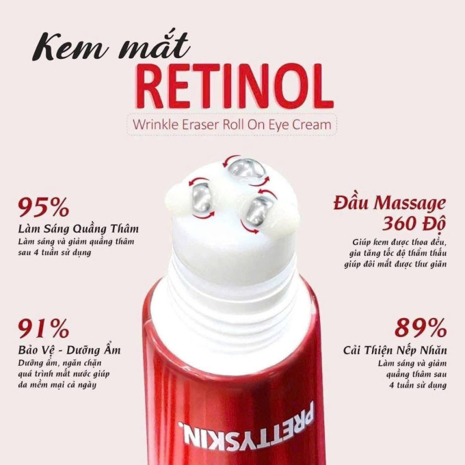 Kem mắt Prettyskin Wrinkle Eraser Roll On Eye Cream Retinol 30ml là sản phẩm chăm sóc vùng da mắt đến từ thương hiệu Pretty Skin Hàn Quốc. Với công thức kết hợp Retinol, Niacinamide, Vitamin C và Vitamin E, kem giúp cải thiện quầng thâm, nếp nhăn và dấu hiệu lão hóa quanh mắt rõ rệt.